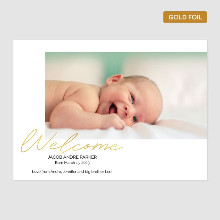 Share life's moments big and small with custom Gold Foil Photo Greeting Cards. Choose from several designs to help you announce a new baby, celebrate a graduation or just say thanks. These are printed with gold foil accents on our classic matte paper, so they're sure to make your good news shine. Each set of cards includes high-quality envelopes with optional printed addresses. All cards include a back option, so there's more room for additional photos or a longer message.
