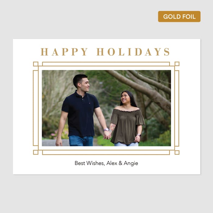 Your selected design and your photos will be printed with archival ink on eco-friendly paper. Accents in gold foil add a festive sparkle to your card. Add a few photos and a heartfelt message to the back of your card to send a little extra cheer.