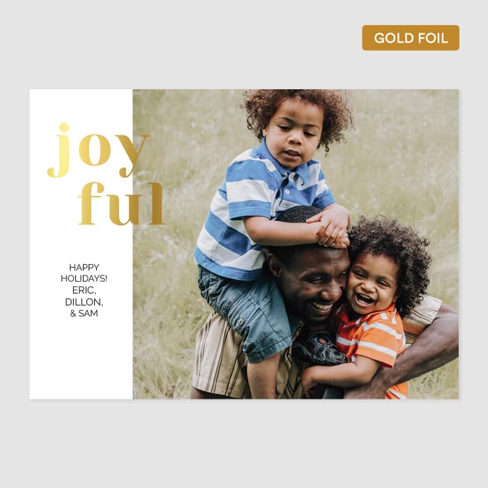 Send love through the mail and right into the hands of your friends and family with a custom holiday card! Choose from 40 Gold Foil designs - with gold foil accents printed on our classic matte paper. Each set of cards comes with a set of high-quality, beautiful envelopes. New this year - all cards include a back option, so there's more room for additional photos or a longer message! It’ll only take a minute to pick a design and add a few family photos to fill it, but your card will be sure to hold the place of honor on grandma’s fridge all year long.